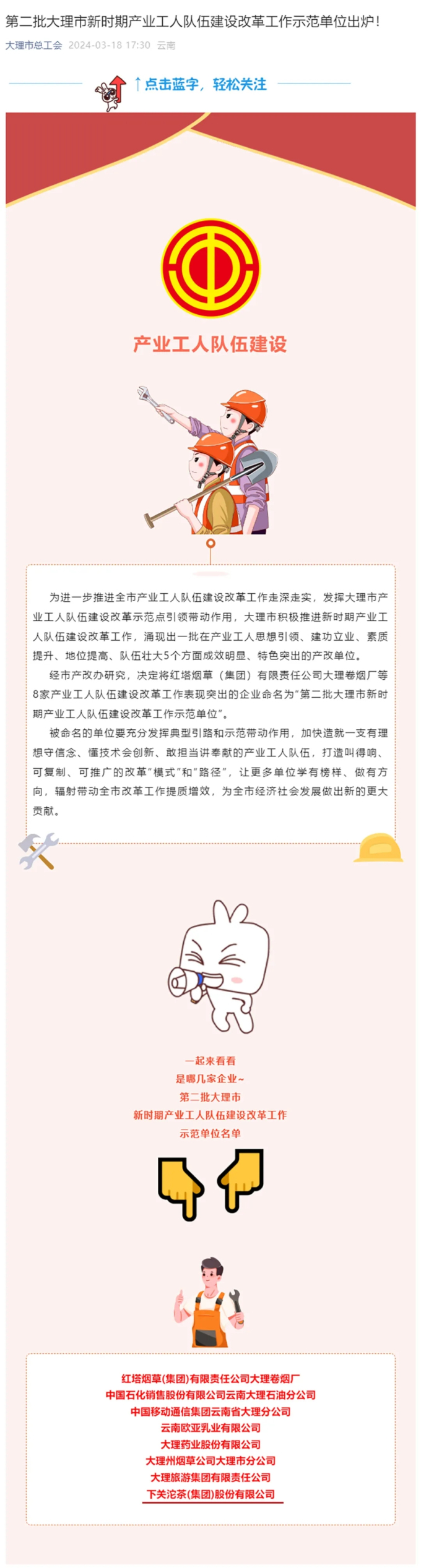 近日,大理市新時期產業工人隊伍建設改革工作領導小組辦公室(大理市總工會)發布了《關于命名第二批大理市產業工人隊伍建設改革示范單位的決定》,下關沱茶集團公司位列示范單位名單中。?以上截選自大理市總工會微信公眾號近年來,在大理州市總工會及相關部門指導下,我公司根據產改工作的總體部署要求,緊密結合生產經營管理實際,圍繞強化基...